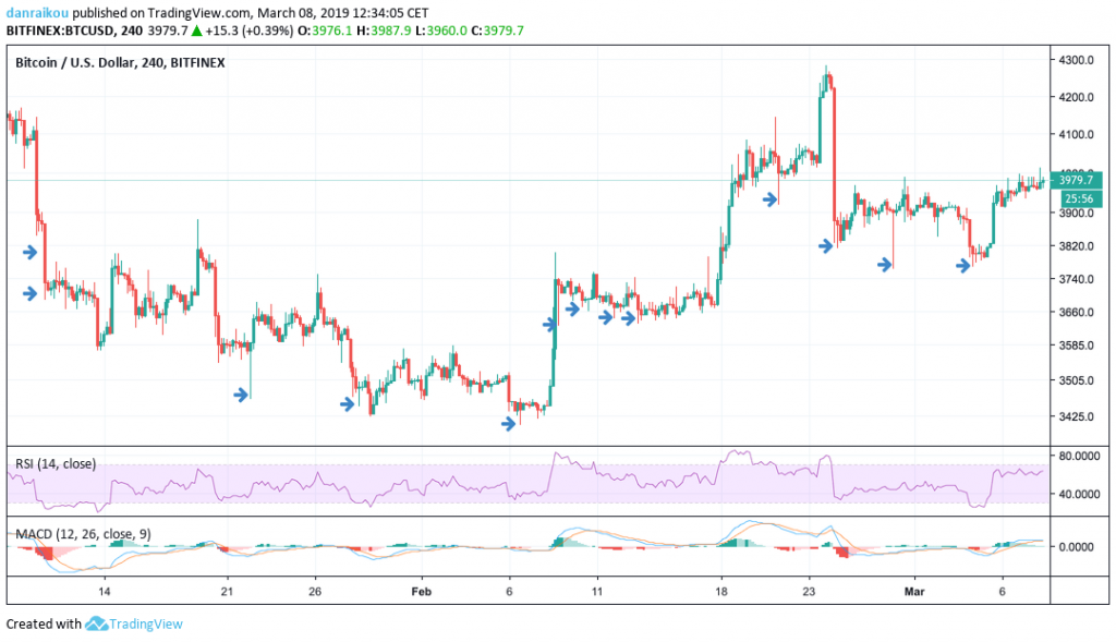 Os indicadores do intervalo de 4 horas do gráfico BTC/USD sugerem que durante os últimos ciclos a Primeira criptomoeda tem tentado, até então sem sucesso, quebrar a barreira dos US$ 4000. Com base na atual convergência do MACD e dos níveis elevados do RSI, mas a ausência presente de volume, podemos concluir que existem boas probabilidades desse padrão se seguir para os próximos movimentos de médio prazo.
