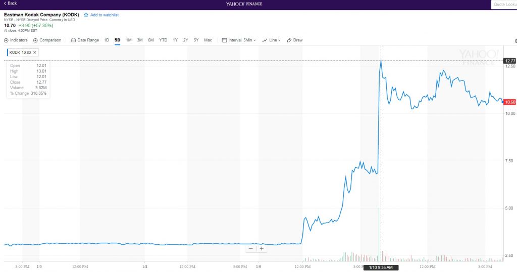 A Kodak, uma conhecida fabricante de equipamentos fotográficos e lenda da indústria, marcou esta semana com vários anúncios relacionados a criptomoedas. Na terça-feira, a empresa anunciou uma moeda digital, a KODAKCoin, uma plataforma de Blockchain – KODAKOne – e a realização de uma ICO; após isso, suas ações subiram de preço. Mais tarde, a empresa anuniou uma mineradora da marca, que muitos já chamaram de fraude.
