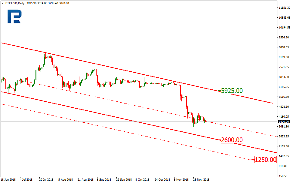 O cronograma diário do BTC continua mostrando o movimento das cotações dentro do canal descendente. Os objetivos da redução estão em sua linha de suporte, e um dos principais deles é a marca de US$2,6 mil. A resistência para a tendência de longo prazo está em torno de US$5.925. A situação atual das velas de preços na área da linha de suporte do corredor interno sugere um consenso de opinião dos touros e ursos em relação ao custo do BTC. A quebra da linha de suporte do canal principal pode permitir que as cotações caiam para o nível de US$1,25 mil.