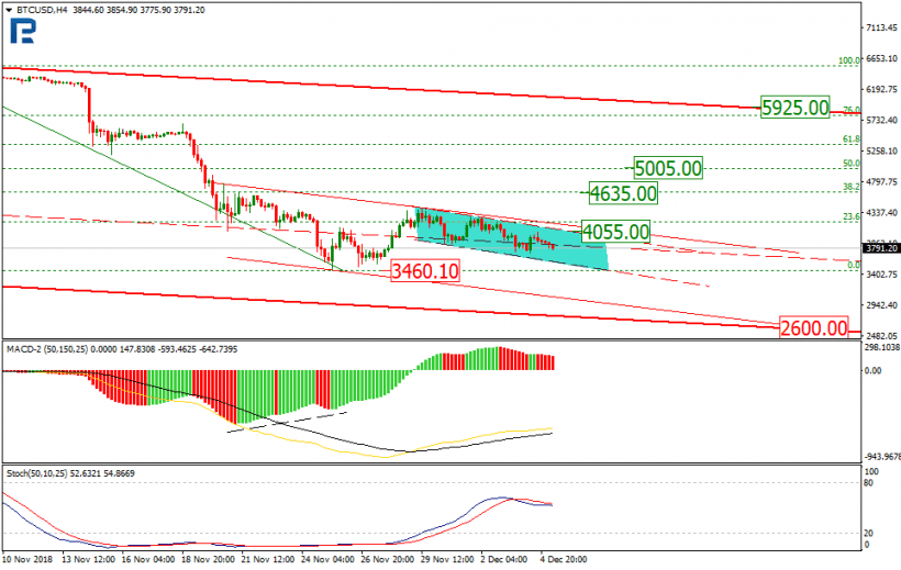 No gráfico de 4 horas, é possível observar o desenvolvimento de uma onda de declínio, cujo objetivo principal será o atual mínimo de US$3.460,10. O teste deste nível pode terminar tanto com uma quebra quanto com um rebote, o que é confirmado pela dinâmica ascendente das linhas MACD. Depois de quebrar o mínimo, o impulso será direcionado ao suporte psicológico de US$3 mil, e depois para o suporte principal em US$2,6 mil. O rebote, por sua vez, pode se transformar em uma extensão da fase de correção. Mas para o desenvolvimento desse cenário, o mercado deve primeiro superar a resistência local em US$4.055. Os objetivos para a possível expansão da fase correcional podem ser os níveis de 38,2% (4635) e 50% (US$5005) na escala de Fibonacci.