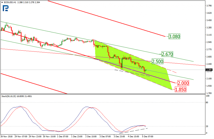 Por outro lado, observando o gráfico EOS no prazo de 1 hora, fica em evidência o desenvolvimento de uma tendência de baixa de curto prazo, cuja meta poderia ser a marca de US$1,85. Ao mesmo tempo, a formação de uma convergência local pode ser observada no indicador Stochastic, o que pode indicar uma iminente correção. A confirmação do início da reversão será uma quebra da resistência atual de US$2,50. A quebra desse nível abrirá o caminho para níveis de resistência de US$2,67 e US$3,08.