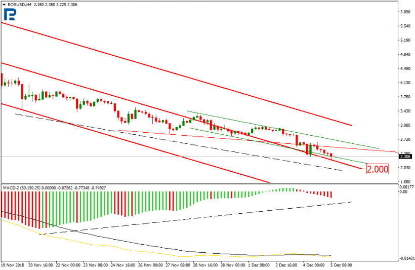 Olhando para a dinâmica do EOS no prazo de 4 horas, é possível ver que, após uma curta correção, as cotações se moveram para o canal de projeção superior e continuaram o desenvolvimento de uma tendência de queda de longo prazo. Atualmente, um teste da linha de suporte pode ser observado. O objetivo dessa tendência de queda é de US$2. Para os investidores, o atual preço do EOS já pode ser considerado atraente para investimentos de longo prazo. Com uma óbvia tendência de baixa no indicador MACD, percebe-se a formação de uma convergência, o que pode significar a iminente retração ou reversão.