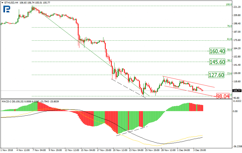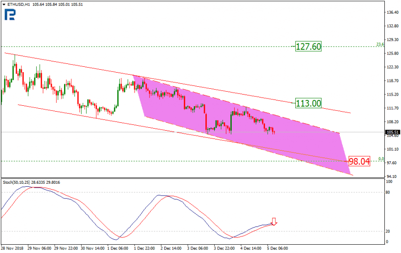 No cronograma de 1 hora para o Ethereum, vale notar o desenvolvimento do impulso atual como parte do canal da tendência descendente. A formação de uma “cruz negra” no indicador Stochastic aponta para a possibilidade de um declínio para o principal suporte local de US$98,04. A quebra do nível de resistência de US$113 pode ser um sinal para o desenvolvimento de uma tendência de alta de curto prazo.