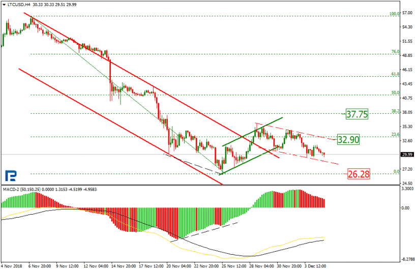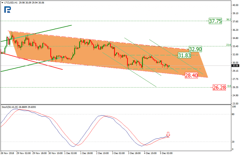 No gráfico de 1 hora para o Litecoin, fica claro que, após o teste da linha de suporte, as cotações saltaram para o canal de projeção superior. O novo impulso da redução é direcionado para o nível de suporte de US$28,40. A emergente “cruz negra” no indicador Stochastic pode ser uma confirmação do desejo do mercado de atingir níveis alvo de suporte. Mas também a formação de uma lateral local de curto prazo não pode ser descartada. Nesse caso, a dinâmica das cotações será fixada entre os níveis de US$29,15 e US$31,83.