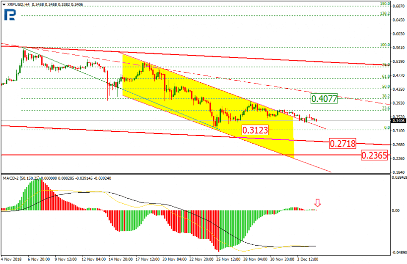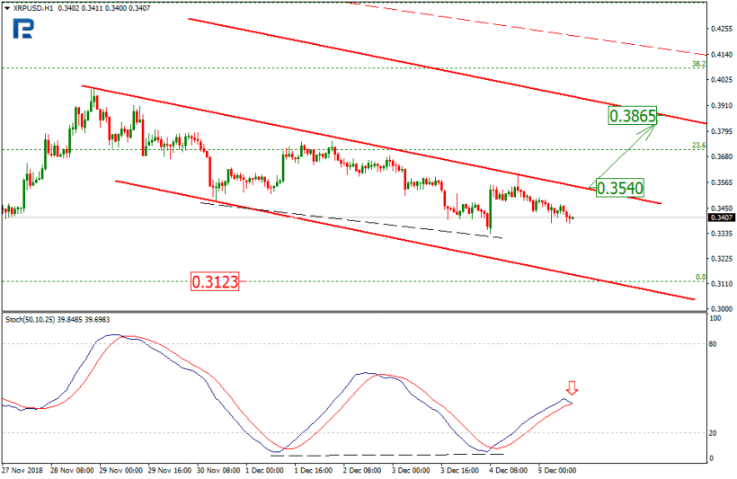 Olhando para o período de 1 hora para o XRP, é possível ver que, após a convergência, as cotações corrigiram a tendência de baixa anterior atingindo a linha de resistência. Agora, a formação de mais um impulso descendente na tendência de queda de curto prazo está em andamento. No entanto, não se pode descartar a possibilidade de que o preço cresça para o nível de resistência de US$0,3540, e após sua quebra, continue para o nível de US$0,3865.
