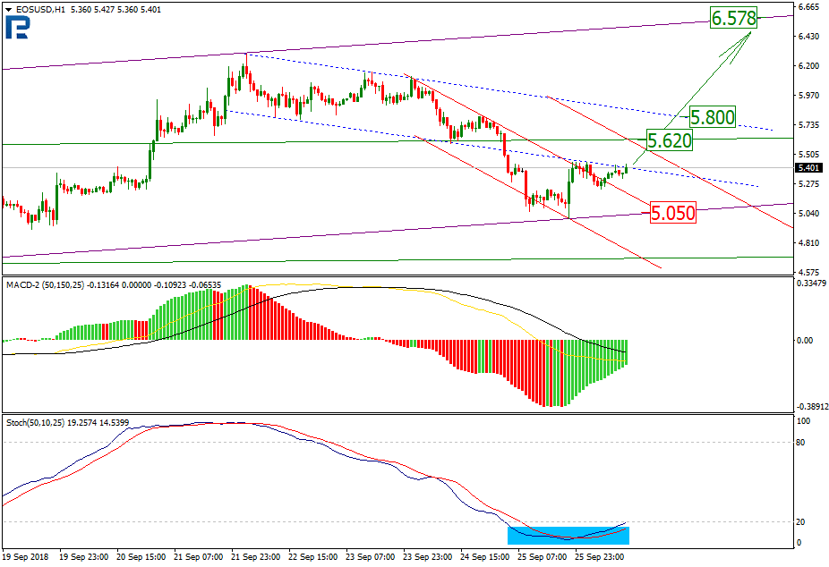 O quadro técnico para o EOS no cronograma horário mostra uma recuperação a partir da linha de suporte do canal de crescimento de médio prazo. Além disso, é possível perceber que o impulso de crescimento superou a resistência do canal descendente. Pode-se supor que, com o apoio da Cruz de Ouro no Stochastic, o mercado está moldando uma nova tendência de crescimento. O principal objetivo da subida pode ser o nível de resistência de projeção: US$5,62. Em seguida, o objetivo será o nível de resistência em US$5,80. Já o principal objetivo da tendência de alta pode ser a resistência do canal de crescimento de médio prazo perto do nível de US$6,57. O suporte principal é a marca de US$5,05.