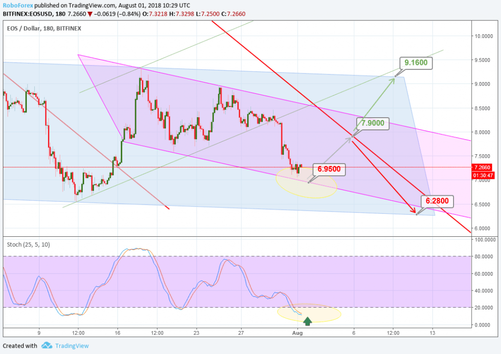 As cotações do EOS no prazo de 3 horas ainda estão presas dentro do corredor corretivo. Ao mesmo tempo, a estrutura da nova tendência de baixa de curto prazo está mirando o nível de suporte de US$6,28, cuja quebra confirmará a continuação do desenvolvimento da tendência de queda de longo prazo.