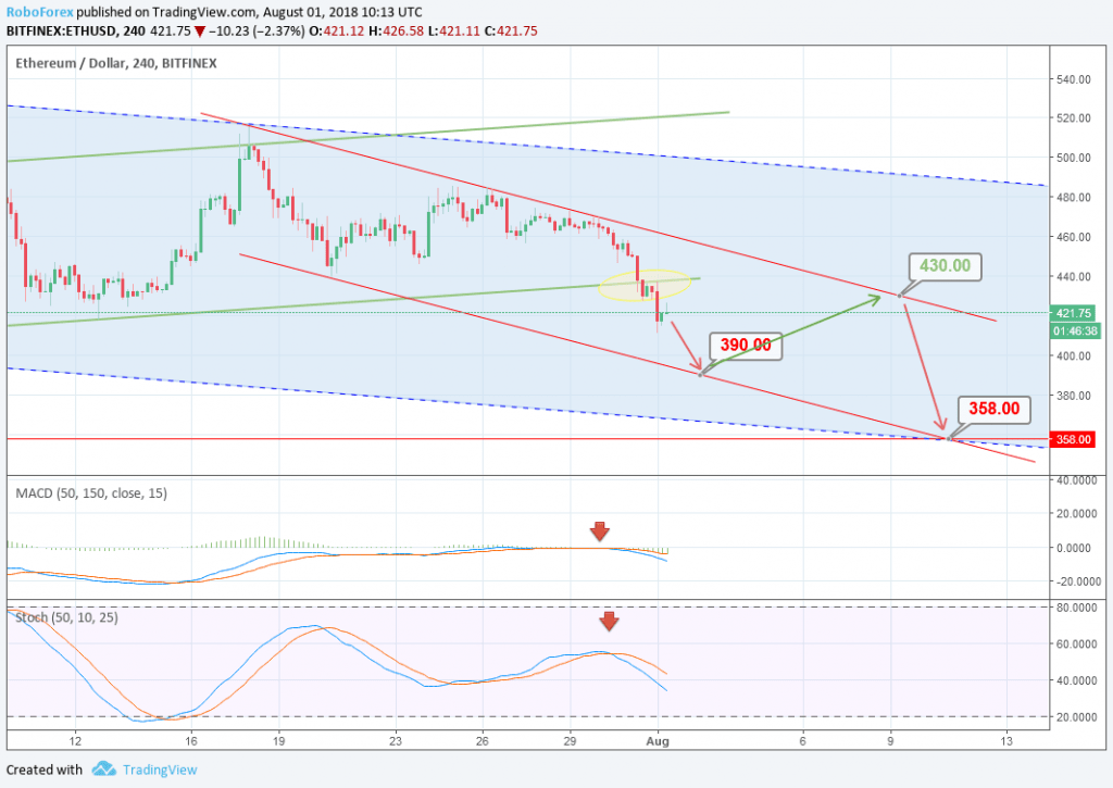 No gráfico de 4 horas, o Ethereum demonstra a superação da linha de apoio do canal correcional, o que pode indicar a continuação do desenvolvimento da tendência de baixa de longo prazo. A seriedade do colapso foi confirmada pela formação das “Cruzes Negras” no MACD e no Stochastic.