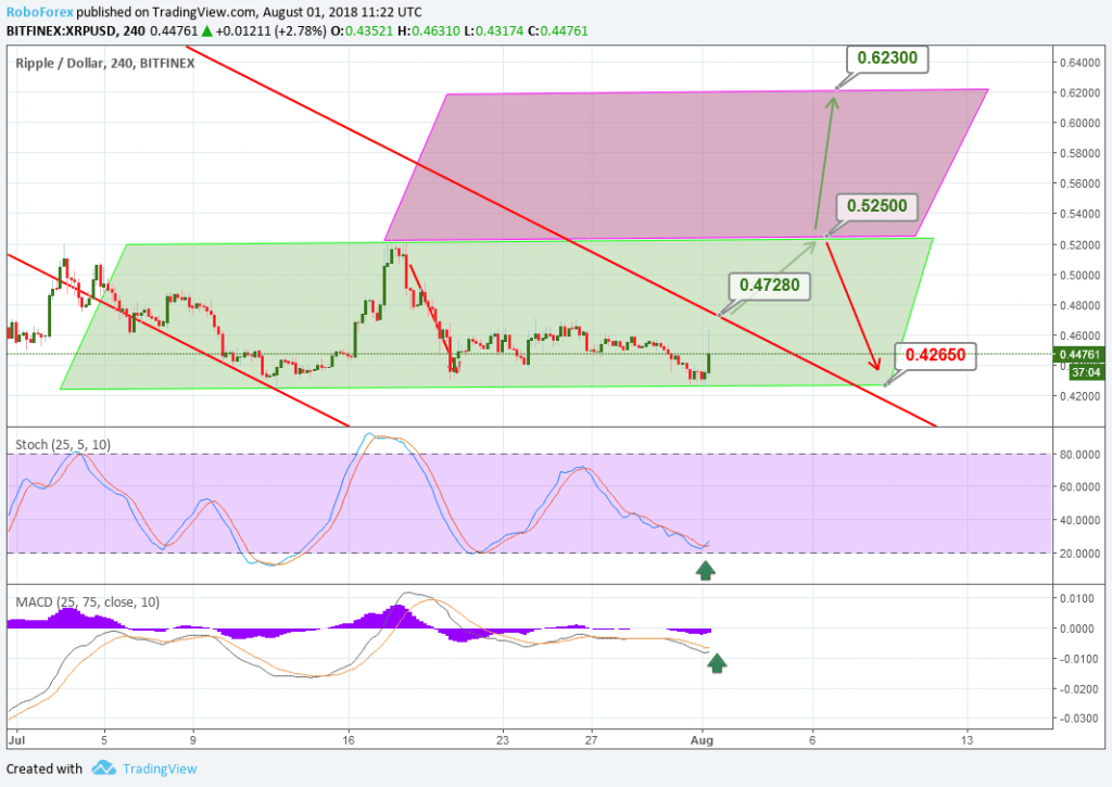 Aproximando-se da linha de apoio, as cotações se recuperaram a partir dela, formando um impulso de crescimento. Este impulso é direcionado, em primeiro lugar, para a linha de resistência do canal de projeção em torno de US$0,4782. Depois de quebrá-lo, as cotações podem continuar a subir para a linha de resistência da atual “lateral” em torno de US$0,5250. A possibilidade de realização deste cenário é indicada pela “Cruz de Ouro” no Stochastic, enquanto um padrão semelhante no MACD apenas confirmará esta hipótese.