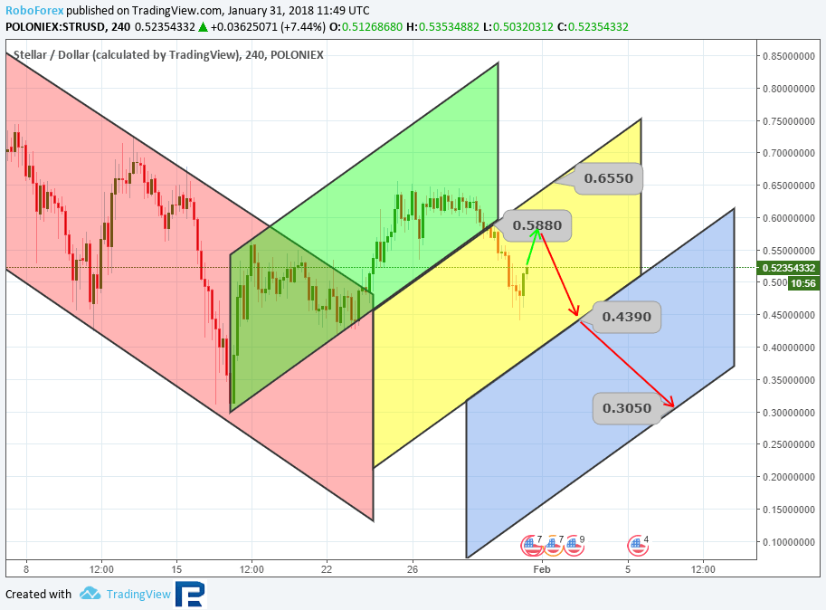 A situação com o Stellar indica a conclusão do aumento corretivo via quebra da linha de suporte do canal ascendente. No momento, as cotações tendem à linha de apoio do corredor de projeção.