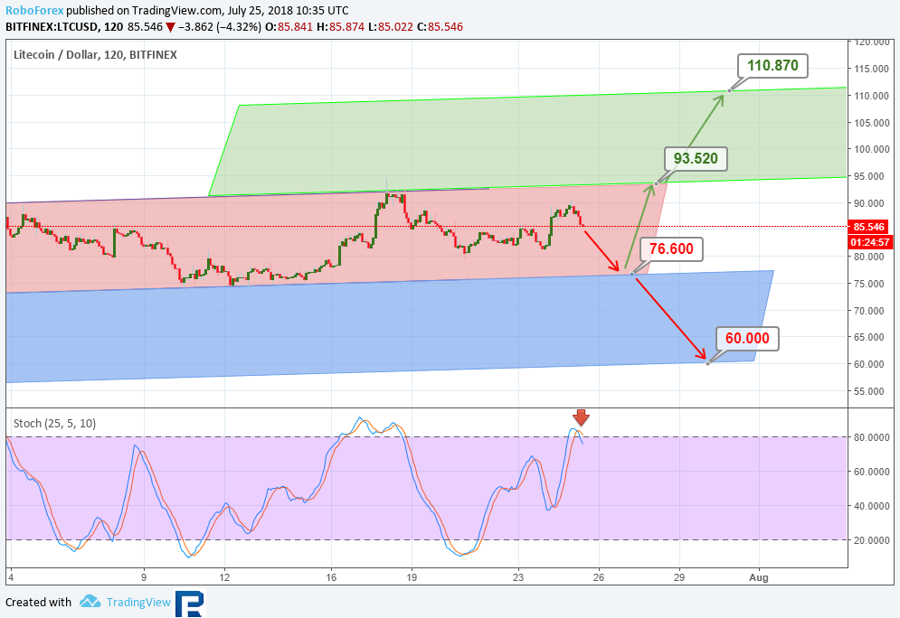 As cotações do Litecoin estão dentro da estrutura do corredor ascendente, mas a “Cruz Negra” na zona de “sobrecompras” pode representar o próximo declínio para o nível de apoio em US$76,60. Em seguida, a situação pode se desenvolver de acordo com o modelo clássico: “um rebote ou uma quebra”.