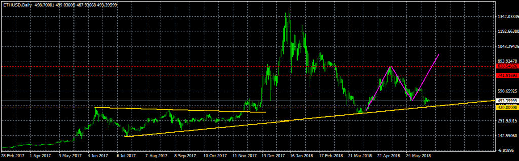 O Ether está perto do nível, a partir do qual muitos começarão a comprar. O preço está próximo da linha de tendência de longo prazo, gerada no ano passado durante a formação de um enorme triângulo. O último foi quebrado no verão passado, após o qual o preço desenhou alguns “x”.