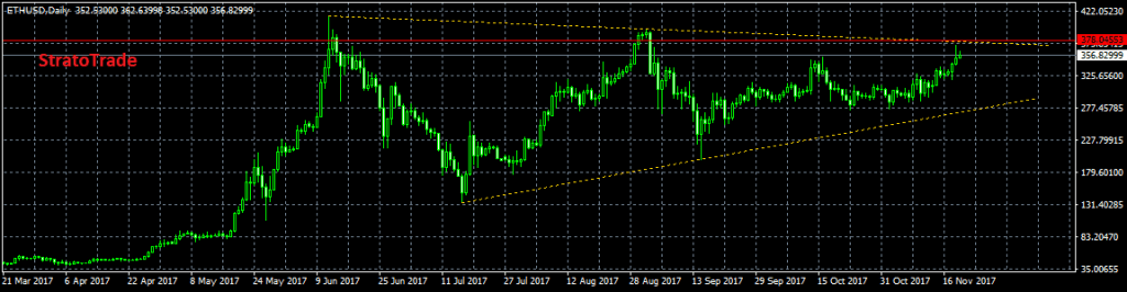Não podemos deixar de escrever sobre o Ethereum. Ainda alguns meses atrás, sugerimos que o ETH está se movendo dentro do triângulo global no cronograma diário. Atualmente, ele se encontra no estágio final e o preço está próximo ao nível superior da borda do triângulo (a área de US$380).