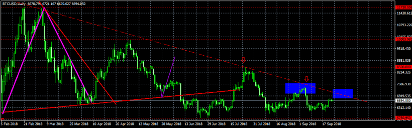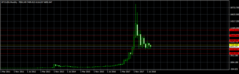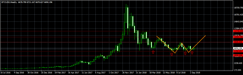 O nível positivo para o fechamento do mês foi marcado com a linha horizontal amarela. Caso atingido, haverá boas chances de romper a resistência de vários meses em outubro. Essa linha agora está localizada na região de US$6,9 mil – US$7,1 mil.