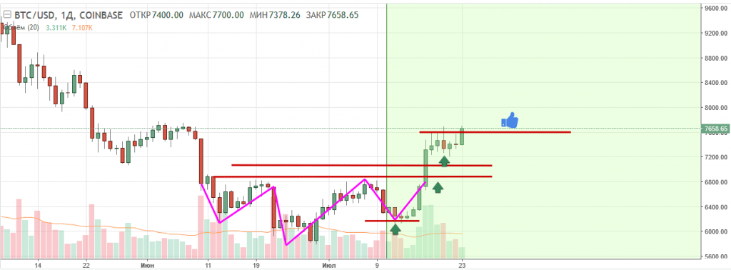 O que está por vir agora? Após uma quebra de US$6,8 mil – 7 mil, observamos uma consolidação do preço por vários dias, bem como o acúmulo de volumes. Hoje, o preço subiu com novas forças.