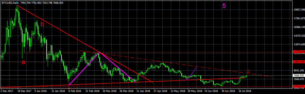 O mais provável é que o preço atinja o nível de US$7,9 mil – 8 mil e, em seguida, as vendas maciças se iniciem. A partir do nível de US$8 mil, será possível aguardar uma correção de curto prazo, que se assemelhará com uma lateral com um leve declínio no gráfico.