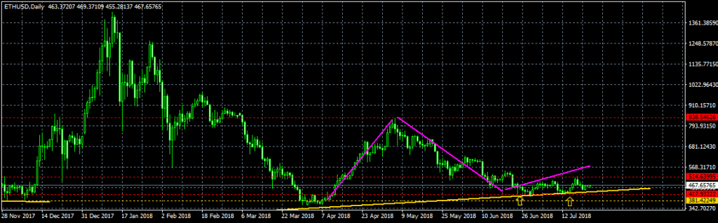 Como esperado, o ETH conseguiu atualizar o máximo local e atingir US$514. Em seguida, uma reversão veio contra o fundo do movimento de fundos de altcoins para o BTC. Esta semana, um novo teste de US$500 é esperado, e depois uma consolidação acima dele. O objetivo do novo movimento será o nível de US$550 – 560.