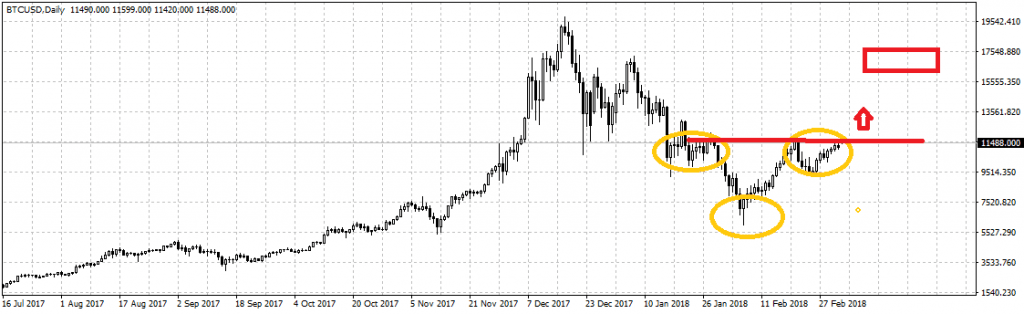 Observando o gráfico, é possível observar que a figura de “cabeça e ombros invertidos” está claramente visível. O nível do pescoço é na região de US$11,7 mil – 11,8 mil. Caso ele seja quebrado e o preço se consolide acima de US$12 mil, o alvo dessa figura será a área de US$17 mil. A altura da “cabeça” para a linha do pescoço é de cerca de US$5 mil – é esse valor que o preço percorrerá quando a implementação desta figua ocorrer.