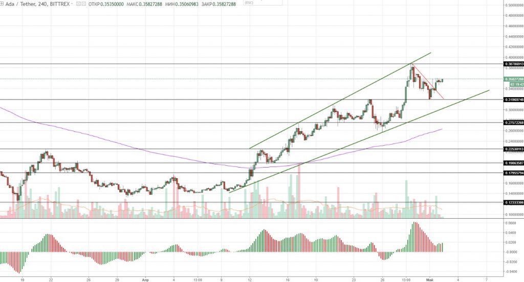 Para o subsequente movimento, o próximo nível de resistência será de US$0,38. Neste ponto, o preço pode formar um movimento corretivo e retornar ao nível de US$0,32, formando, dessa forma, uma figura de reversão denominada “Pico duplo”.