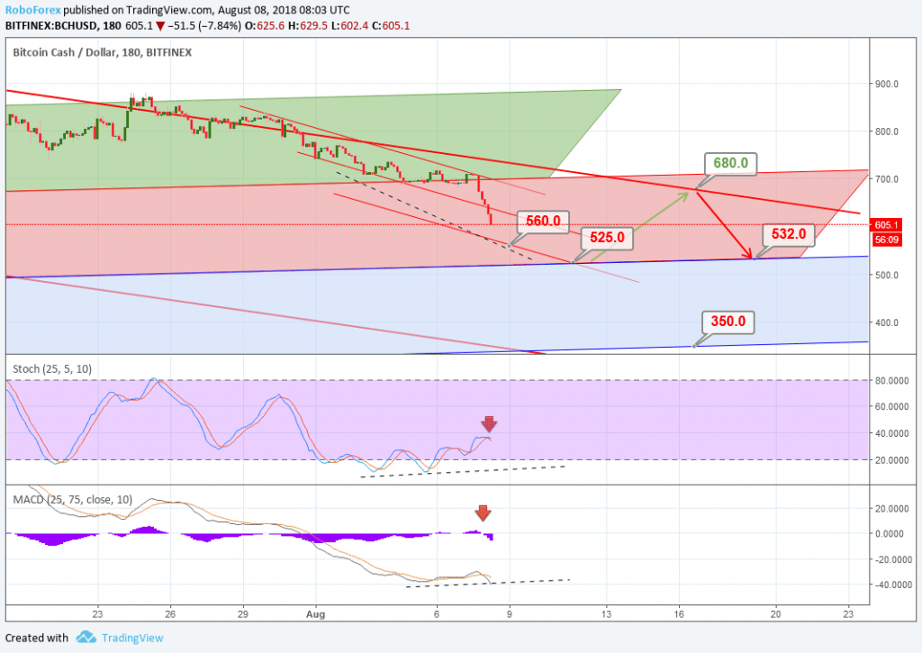 Observando a dinâmica das cotações do Bitcoin Cash em um prazo de duas horas, percebe-se que o mercado conseguiu atingir metas locais de redução. Além disso, o mercado testou e rompeu a linha de suporte do corredor corretivo anterior, o que foi confirmado pelas “Cruzes Negras” no MACD e no Stochastic.