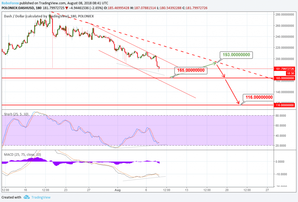No cronograma de três horas, a situação atual com o DASH pode ser chamada de tendência de baixa estável. Tendo superado o último mínimo local, as cotações estão se movendo para o nível de suporte fractal: US$165.