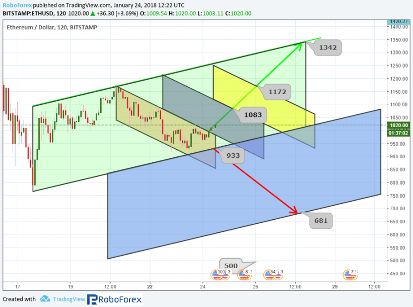Em caso de desenvolvimento estável da tendência de alta, o próximo alvo será o nível de US$1.172. Não se pode excluir também a possibilidade de quebra da linha de suporte perto da marca de US$933. Neste caso, o alvo do impulso descendente será na linha de suporte do canal de projeção – perto da marca de US$681.