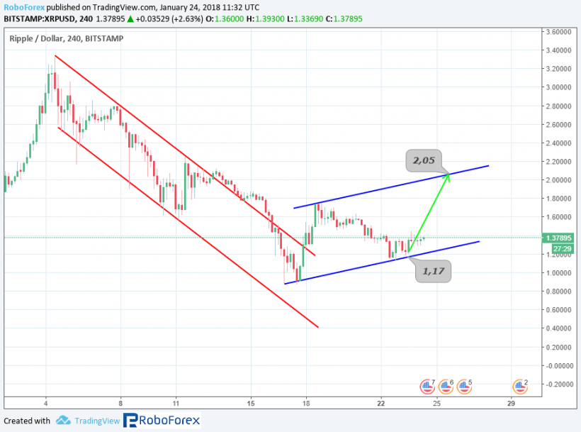 A tendência descendente para o Ripple foi substituída por um aumento. A tendência de baixa anterior era estável e rápida, e o corredor de movimento era estreito. O canal atual da tendência de alta emergente é amplo, o que permite considerar o movimento ascendente apenas uma correção do impulso de baixa anterior.