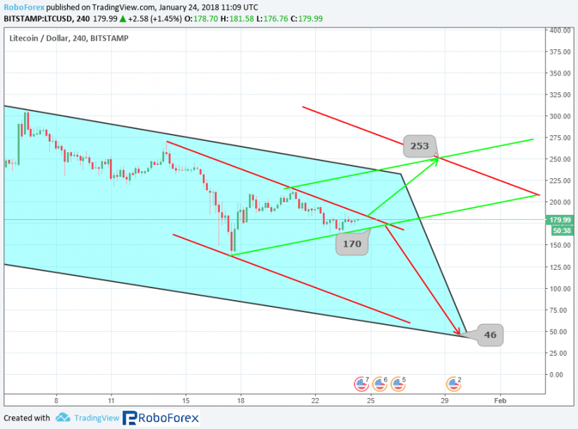 A situação atual para o Litecoin ainda é caracterizada como uma tendência de baixa. No entanto, o principal e decisivo fator para futuras dinâmicas do LTC será o teste da linha de resistência no canal decendente local.