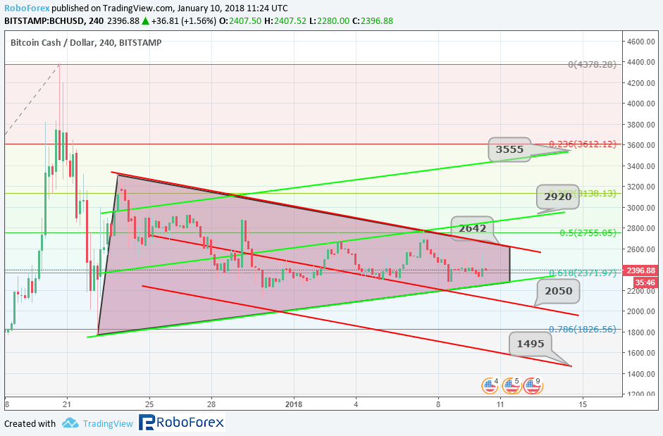 A imagem técnica da situação com o Bitcoin Cash mostra que a tendência ascendente anterior foi corrigida pelo subsequente movimento descendente em 76% na escala de Fibonacci. O gráfico atual da dinâmica do BCH demonstra um estreitamento de consolidação. Esta característica estrutural geralmente termina com uma explosão de compras ou vendas, dependendo de em qual área o mercado quebra: nével de suporte ou resistência.