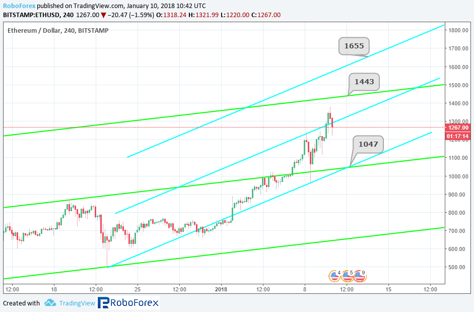 Do ponto de vista da análise técnica, a tendência para o Ethereum ainda é ascendente – ela ainda se desenvolve com aceleração. O corredor da tendência ascendente a longo prazo foi quebrado na área da linha de resistência, que abriu o caminho das cotações ao corredor de projeção. O objetivo principal deste movimento pode ser a marca de US$1.443.