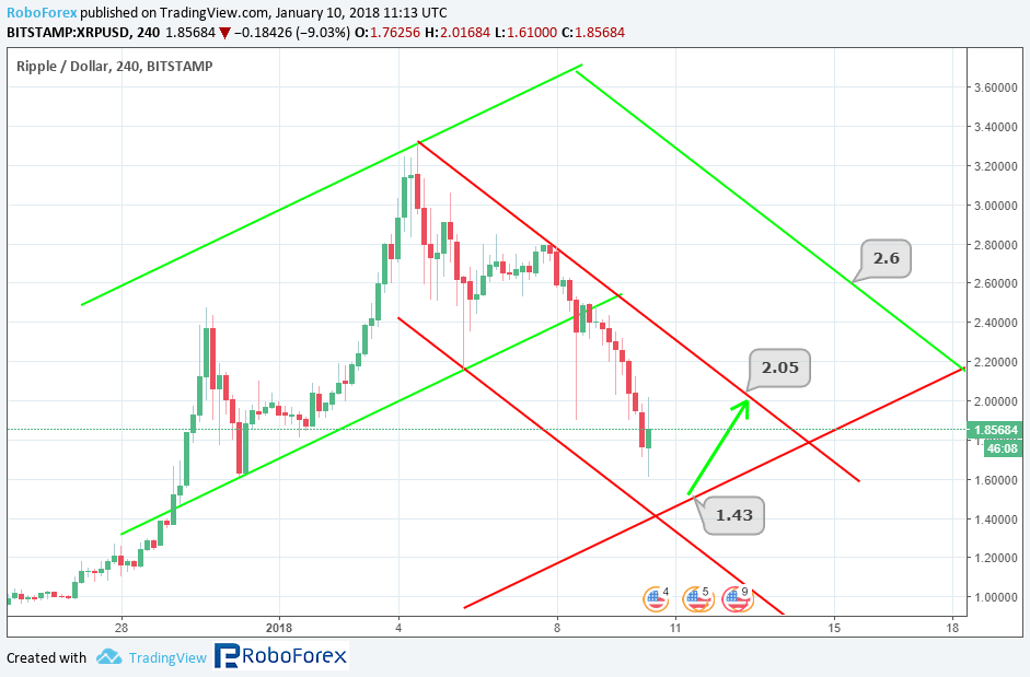 A tendência atual para o Ripple é de baixa. O principal objetivo do movimento atual é a marcação da linha de suporte do corredor de projeção na região de US$1,43. Após a finalização desse cenário, pode-se esperar um aumento das cotações para a linha de resistência atual – nível de US$2,05. A quebra deste nível levará as cotações para a marca de US$2,60.