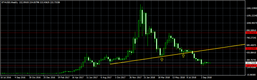 A situação com o Ethereum é parecida: o movimento plano já dura um mês. O Ethereum não subirá até que o BTC faça o mesmo. Devido à fraqueza do Ethereum, muitas altcoins cresceram fortemente em relação a ele. É preciso acompanhar esses pares com muito cuidado agora, porque imediatamente após uma reversão do Ethereum, essas altcoins começarão a cair em preço.