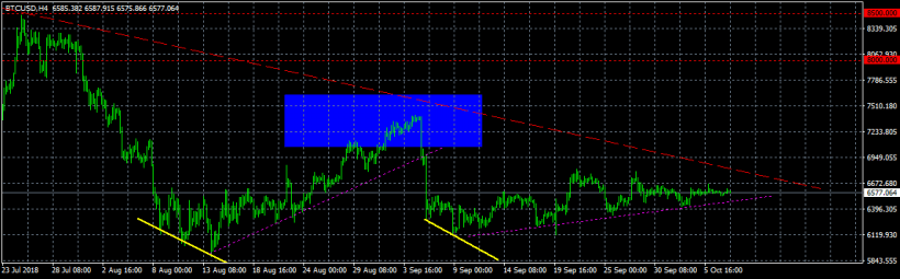 No gráfico de 4 horas, a situação é semelhante à de agosto e setembro, quando o preço manteve-se em um suave crescimento durante metade do mês e depois caiu drasticamente, formando uma bandeira de ursos. – é possível que algo semelhante esteja sendo formado agora, mas com menor amplitude e inclinação.