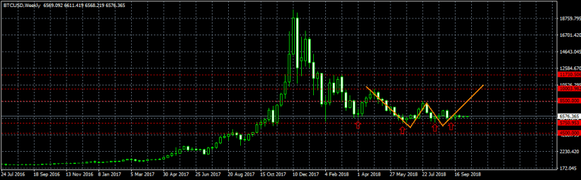 Como esperado, a semana passada terminou com um movimento plano. O intervalo de flutuações é tão estreito que as velas são quase invisíveis no período semanal.