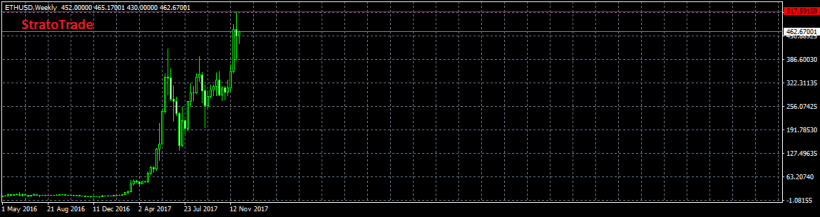 Com um alto grau de probabilidade, o preço tenderá novamente para o nível de US$520. É altamente improvável que o preço do ETH suba mais que isso nessa semana. A vela semanal não fechou muito bem para os touros e está na forma do Doji (uma vela potencialmente reversível). No entanto, se o caráter positivo geral dos criptomercados persistir e os touros forem persistentes, não haverá reversão – para isso, a semana deve ser fechada acima de US$460.