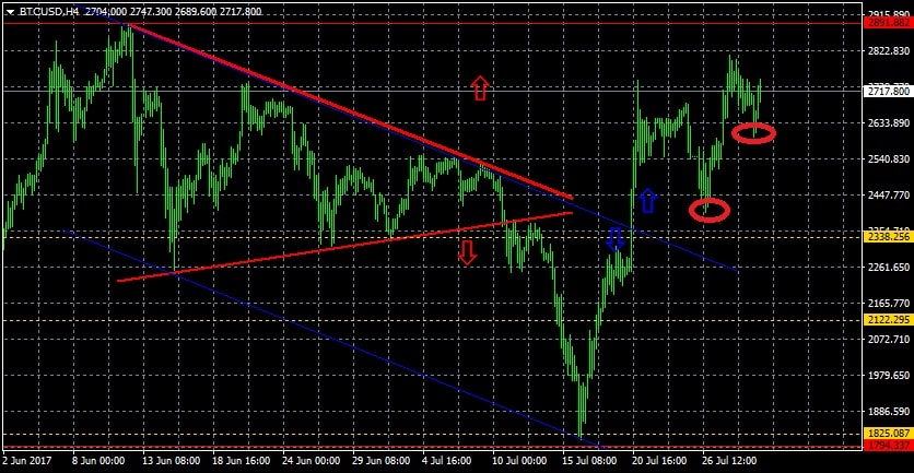 Duas semanas atrás, após o colapso, houve um rápido crescimento do Bitcoin, o preço foi quebrado por um poderoso movimento descendente positivo(ou “bandeira”) na região de US$ 2350.