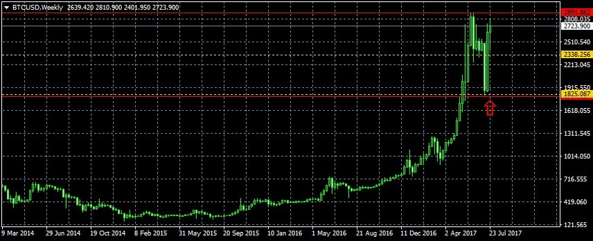 No gráfico semanal formou-se a figura de “Absorção Bullish”, que é um sinal forte para o crescimento e, no futuro, várias semanas se passaram ate atingir a marca de US$ 2900-3000.