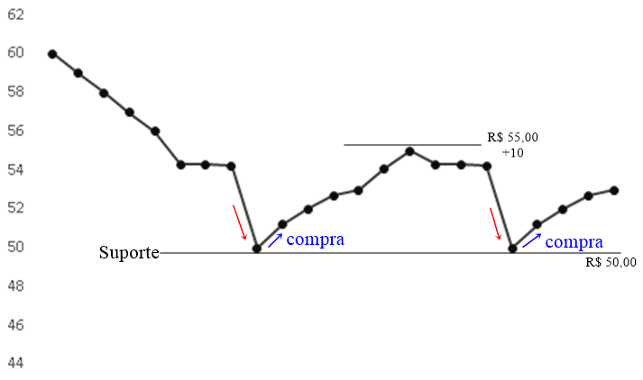 Suponha que ao observar o comportamento de uma ação, por exemplo, é perceptível que após um período de desvalorização, o preço caiu até o patamar de R$50, sendo que após esse valor, a tendência foi revertida e o preço subiu cerca de 10% chegando ao patamar de R$55.