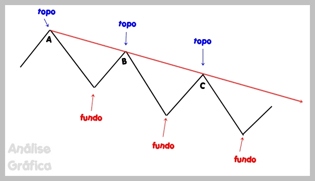 É possível visualizar no gráfico uma tendência de baixa caracterizada por topos e fundos cada vez mais baixos. Assim, para traçar uma linha de tendência de baixa, basta ligar o topo A (topo mais alto da tendência), passar pelo ponto B e, por fim, chegar ao ponto C (topo mais baixo da tendência).