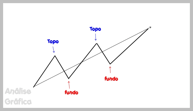 Para entender melhor, basta observar o gráfico abaixo, onde é possível perceber que a cada movimento, o topo é cada vez mais alto, ou seja, a cada movimento, o ativo supera a sua máxima. Além disso, a cada movimentação, o fundo atingido pelo ativo também é cada vez mais alto.