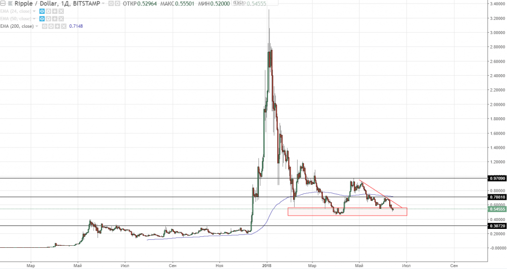 O preço desta criptomoeda foi fixado abaixo do nível de suporte de US$881, bem como abaixo da linha de tendência, que desempenhava o papel de suporte. A probabilidade do fortalecimento da tendência de baixa é bem alta, sendo que a próxima meta pode ser o nível de US$615,17.