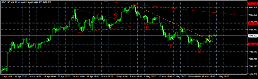 Para os traders que negociam ativamente Bitcoins durante o dia e a médio prazo, a principal intriga da semana anterior foi a linha de tendência descendente no gráfico de quatro horas – o preço a alcançou por diversas vezes, o que foi seguido por vendas massivas e atualizações do mínimo local. Na tarde de domingo, no entanto, houve uma quebra, e o Bitcoin subiu para a marca de US$8,5 mil.