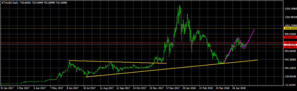 E aqui está a mesma situação no gráfico diário. Em meados de abril, um triângulo e uma linha de tendência descendente foram quebrados, o que pesou no curso do Bitcoin desde janeiro. Depois disso, um triângulo mais plano foi formado, dentro do qual o atual movimento está ocorrendo. Após sua quebra, a marca de US$ 11,7 mil será atingida rapidamente.