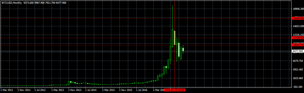 O gráfico mensal, no entanto, até agora não parece tão positivo: a vela atualmente possui um corpo pessimista e nos 10 dias restantes, será preciso atingir a marca de US$10 mil, caso contrário, os vendedores terão novamente sua chance.