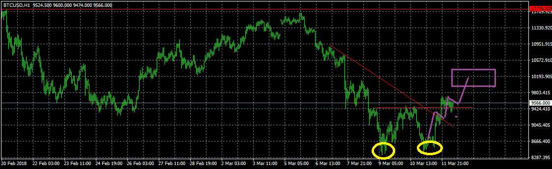 Finalmente, o gráfico horário de hoje. Ontem, o Bitcoin desenhou lindamente um “fundo duplo” neste cronograma, depois demonstrou um crescimento de impulso e quebrou a linha de tendência descendente local. Agora, é possível observar uma consolidação, e, dessa forma, espera-se que a onda local atinja o nível de US$10 mil: