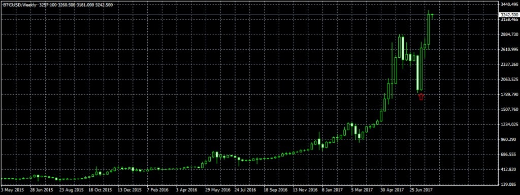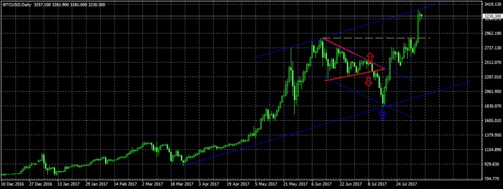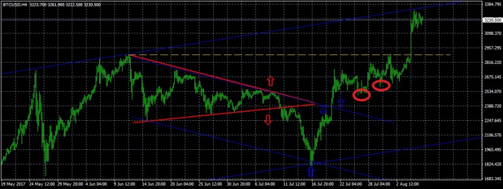 Havia uma variante de formação de um topo duplo, o preço “carimbado” por muito tempo em torno de US$ 2800-2900, realizando periodicamente tentativas de diminuição, que foram severamente suprimidas pelos touros (tendência de alta do mercado). Há uma opinião de que o rápido crescimento foi desencadeado pela cotação maciça do Bitcoin Cash no Bitcoin.