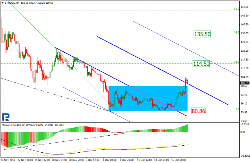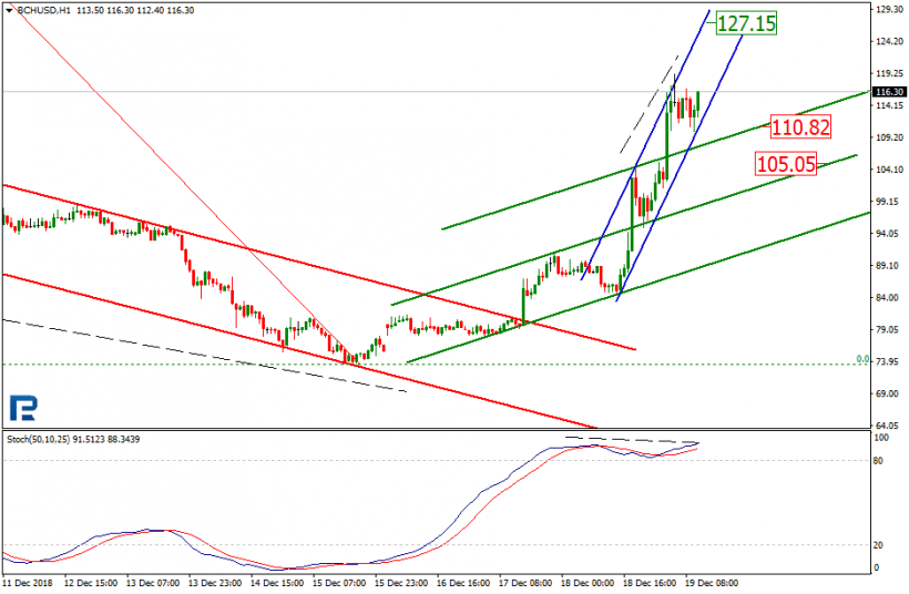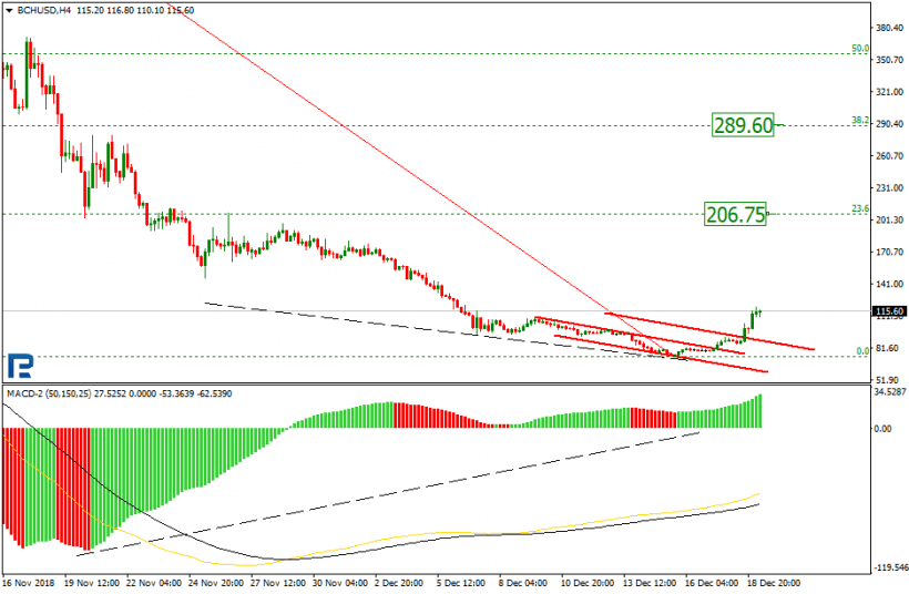 No gráfico horário do BCH, é possível observar o desenvolvimento de um impulso de crescimento rápido, cujo objetivo pode ser o nível de US$127,15. Adicionalmente, uma divergência está sendo formada no indicador Stochastic, que, por sua vez, pode significar uma correção iminente. Como objetivos dessa última, deve-se considerar os níveis de US$110,82 e US$105,05.