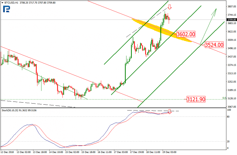 Tendo superado o nível de US$3.602, as cotações podem diminuir para o suporte de projeção em US$3.524. Em seguida, será possível esperar pela formação de mais um impulso ascendente.