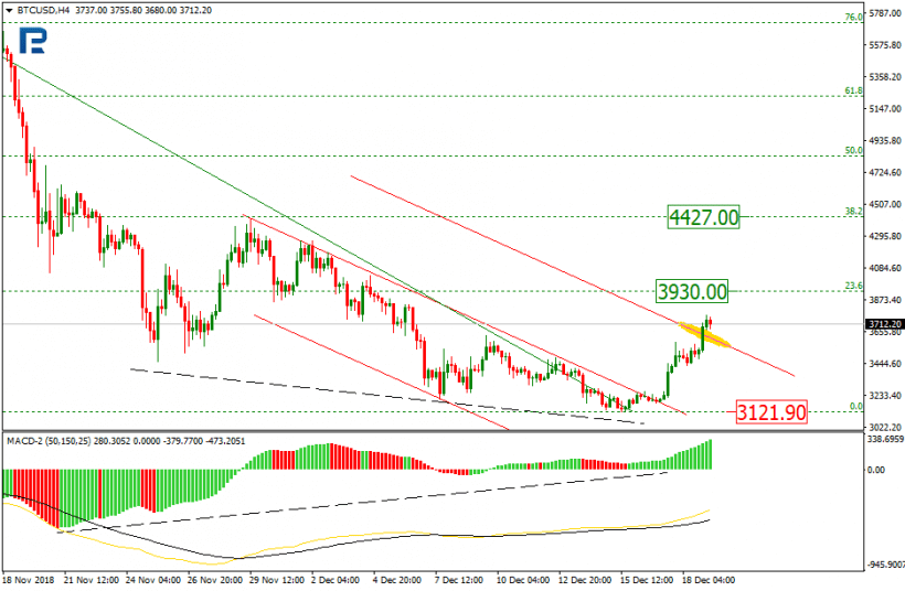 No gráfico de 4 horas para o BTC, é possível observar que, após uma lenta atualização dos mínimos, uma formação prolongada de convergência no MACD e um teste da resistência do corredor descendente, as cotações o romperam com sucesso e atingiram a linha de resistência alvo do canal superior de projeção.
