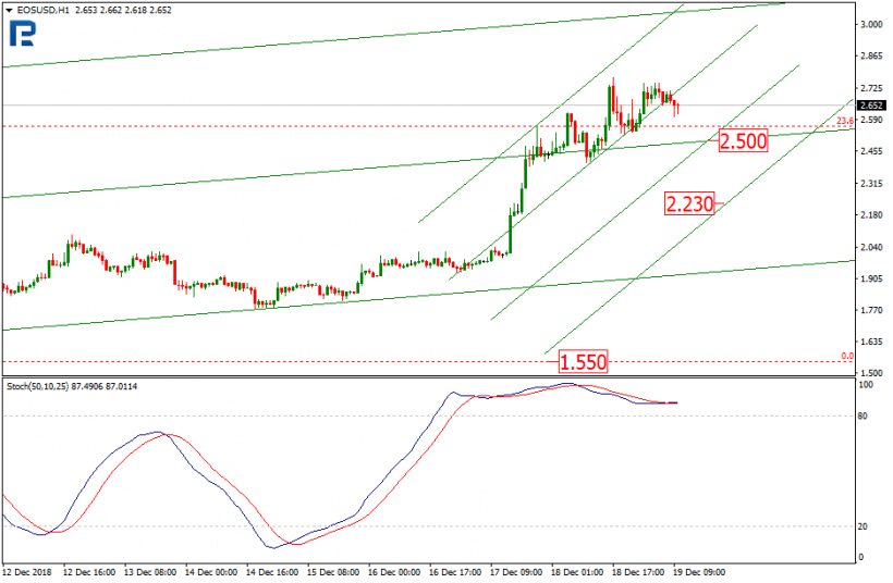 Ao considerar o gráfico do EOS no cronograma horário, é possível perceber que o Stochastic está formando uma “Cruz Negra”, e que as cotações estão tentando romper a linha de suporte do último canal de crescimento. Juntos, esses fatores indicam o início de uma retração de curto prazo. Como objetivo imediato da correção, vale considerar o nível de suporte do canal de projeção inferior: US$2,50; o próximo alvo pode ser a marca de US$2,23.